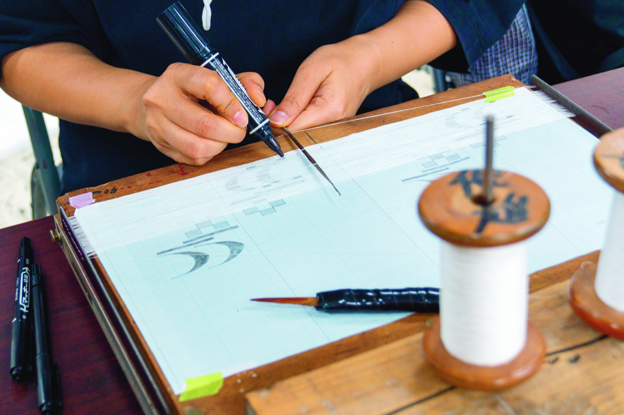 - 絣の織物は図案に合わせて糸を先染めします。種糸取りは、染め分けの目印となる糸を作る最初の作業です。産地の中でも技術者が限られる、絣づくりの手仕事の技を直接ご覧いただだけます。
