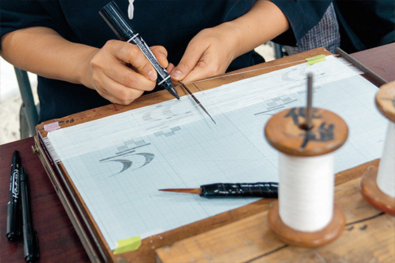 RYUKYU-KASURI: Taneito-tori (marking of kasuri parts with ink according to the pattern for kasuri tying)