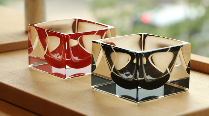 アワビ貝の下に重ねる色によって、半貴石のようなバリエーションが生まれる青貝塗の螺鈿はジュエリーに。ほっこりと木目を楽しむなら、漆をあえて薄く塗って豆皿に。飲み物を注げば底から立体的に浮かび上がる漆はクリスタルグラスで。七変化する漆の美しさをお見せします。