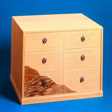 始まりは平安時代に遡ります。室町時代以後には専門の指物師が現れ、茶道文化の確立とともに、京指物も発展しました。 無垢板(むくいた)を用いた高級和家具の調度指物と、キリ、スギ、クワ、ケヤキ等の木の素材を生かした挽物(ひきもの)、曲物、板物等の茶道具指物があります。