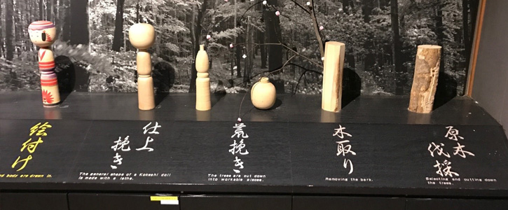 弥治郎こけし村では作品展示館でこけしの歴史を学ぶことができるほか、実際にこけし工人(こけしを作る職人さんは、職人ではなく工人と呼ぶそうです)の仕事を間近で見ることができます。また、訪れた人が楽しめるよう、こけしの絵付け体験などの催しが定期的にあります。