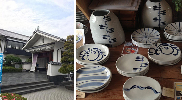 左 砥部焼伝統産業会館。砥部焼の成り立ちから現状までを資料館を見ながら学びました。また問題点や課題についても伺い意見を交換することができました。/右 親しみやすい砥部焼は手ぬぐいとの相性もよく、新たな売り方の展開に期待が高まります。
