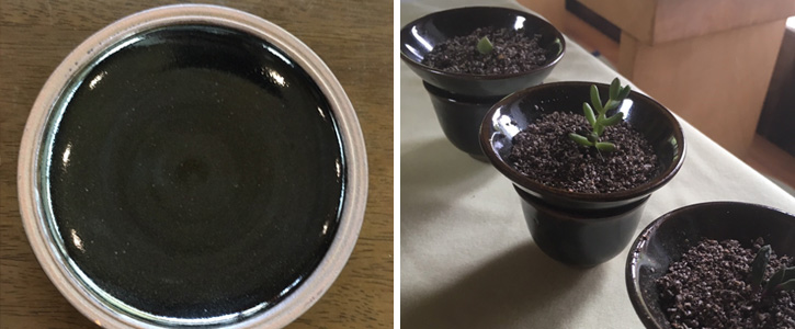 その一方で、奥様がそらきゅう(底に穴のあいた鹿児島ならではの杯。高台がなく指で穴を塞がないといけないため置けない…!)を多肉植物の鉢にアレンジするというナイスアイデアに出会うことが出来ました。こちらは店舗でも販売予定です。ぜひ見にいらしてください。