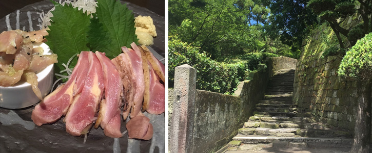 薩摩焼の窯元は、鹿児島県内中に散らばっており、車移動で周ったために非常にタイトなスケジュールとなりました。実はゆっくりご飯を食べる時間もなく、最終日にやっとありついた薩摩地鶏のとり刺しです。本場の鮮度は言葉を失うほどで、力強い噛みごたえと濃い味で鹿児島を感じました。帰途、空港へ向かう途中、島津氏別邸の仙巌園へ行きました。こちらの広大な庭園や石段、門は「篤姫」のロケに多く使用されたとのことです。鹿児島を舞台にした大河ドラマはこれまでにも意外と多く、県内でも来年の「西郷どん」への期待が端々に感じられました。