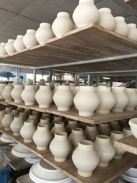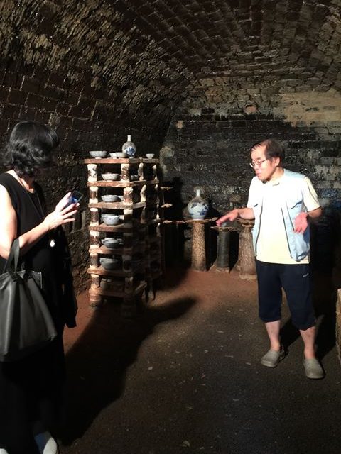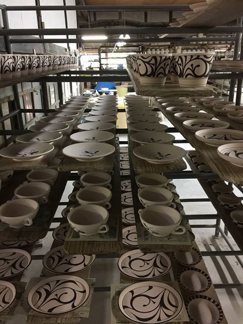 梅山窯さんでは古陶とは別に今まで作られた器、そして販売所にはかなりの型数、絵柄の器が展示販売されています。魅力的な物が多かったのでセレクトが難しかったのですが、JTCW用に型数も6型、柄は20柄程度に絞りました。せっかくの機会でしたので私どもが服のフリントにつかったオリジナルのスプーン柄のカップや丼、そしてもともと梅山さんがお持ちの印判柄も特別に他の器にのせて頂いたりと素敵なコラボ商品も作って頂く事になりました。そして希少ではありますが今でも作られている淡黄磁もJTCWの会期中に販売させて頂く事になりました。