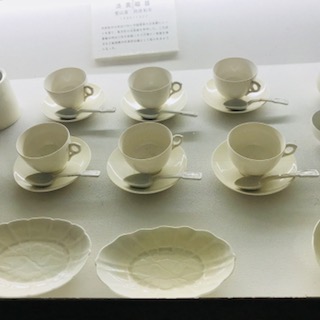 今回の取り組み先である「梅山窯」は砥部で一番歴史の古い窯元です。梅山窯の古陶資料館には貴重な陶器はもちろんの事、棟方志向、柳宗悦の書などもあり大変興味深く見学しました。砥部焼は白磁に染付の印象がありますが、資料館にも展示されていた、まるで象牙のような色合いの無地でフォルムがやさしく美しい淡黄磁との出会いも驚きでした。淡黄磁は1890年に向井和平により創始され、1893年にはシカゴ万博にも出展され高い評価を受け、賞をとっています。ネーミングも美しいと思いました。