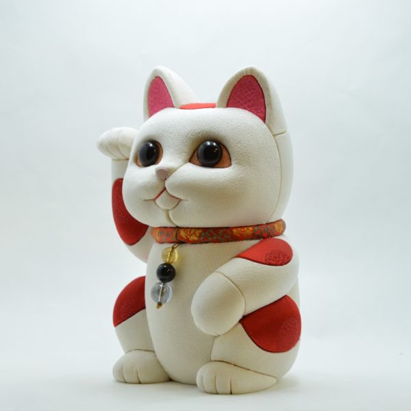 江戸時代中期に、京都・上賀茂神社の祭礼道具を作った際、残った材料を使って木彫りの人形を作り、それに神職の衣装と同じ生地を木目込んだのがはじまりとされています。現在はデザインも多様化し、かわいらしい招き猫など、様々な種類の木目込人形が盛んに作られるようになりました。